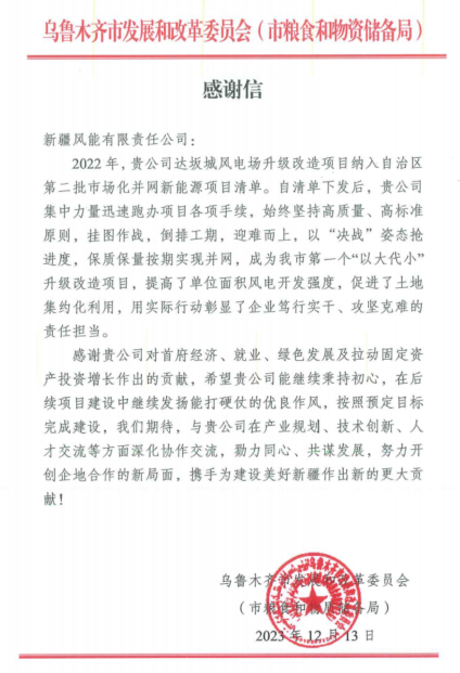 (通訊員 朱鑫鑫/攝影 龔俊屹)12月13日,風(fēng)能公司收到烏魯木齊市發(fā)展和改革委員會(huì)(市糧食和物資儲(chǔ)備局)發(fā)來的感謝信,信中對(duì)風(fēng)能公司達(dá)坂城升級(jí)改造項(xiàng)目在自治區(qū)第二批市場(chǎng)化并網(wǎng)新能源項(xiàng)目中保質(zhì)保量保時(shí)完成并網(wǎng),為首府經(jīng)濟(jì)、就業(yè)、綠色發(fā)展及拉動(dòng)固定資產(chǎn)投資增長(zhǎng)作出的貢獻(xiàn)表示高度肯定和感謝。